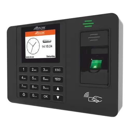 The Realtime C101+ is an offline-mode biometric attendance & access control device that supports fingerprint, RF card (optional) and password verification. It accommodates up to 1,000 fingerprint users (and similarly up to 1,000 card/password users in certain versions), stores around 50,000 attendance records, and features a 2.6″ colour display. Data is exported via USB flash drive in Excel format. The device runs on 12 V DC and draws approx 400 mA idle / 500 mA working current.
